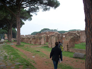 Greatings everyone! What a day full of adventure we had today. Our studio took a field trip out of Citta di Roma and went to the small ruins of the abandoned town of Ostia Antica. The city of Rome is quite the sprawl, but just like NYC, it just takes a short time on a train to leave the sprawl and Vespa exhaust behind for a countryside with clean air that smelt of rain and pine trees. The city of Ostica used to lie along the trading route that is the Tiber River and was later abandoned for a greater facility constructed under the Emperor Trajan. It is now a park of ruins that has a museum full of statuary and decorative cornices. Unfortunately you could not take pictures of the antiquities in the museum, but the ruins are quite beautiful in their own right. Lots of pictures again today and Friday will have a great deal too (this time I will remember to put the SD card in my camera before leaving my flat... Sorry about last Friday).